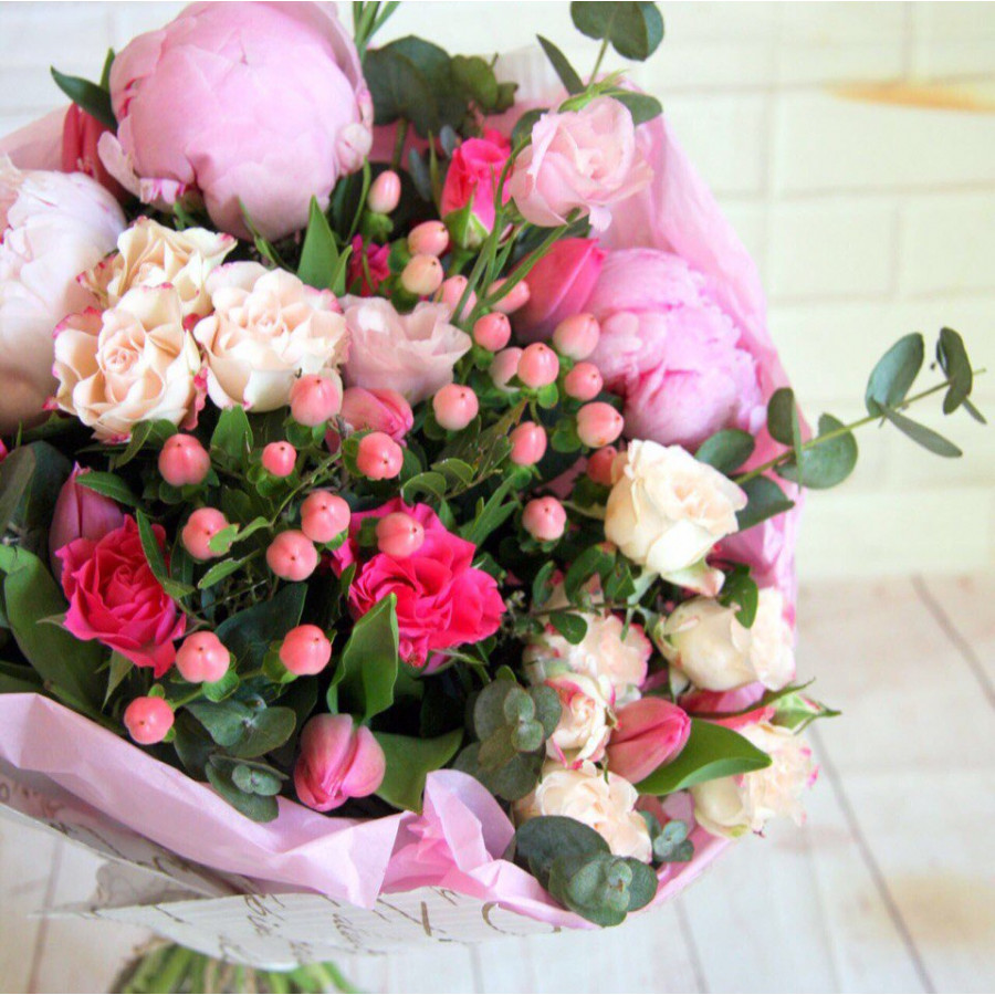 Нежные царственные пионы в окружении миниатюрных гвозди и кустовых роз с оригинальными ягодками гиперикума и тонким тюльпаном - это потрясающий подарок без повода, созданный нашими флористами для того, чтобы Вы могли каждый день радовать своих любимых прекрасными цветами. Этот букет создаст красочное настроение и окружит получательницу заботой и любовью.