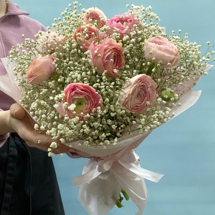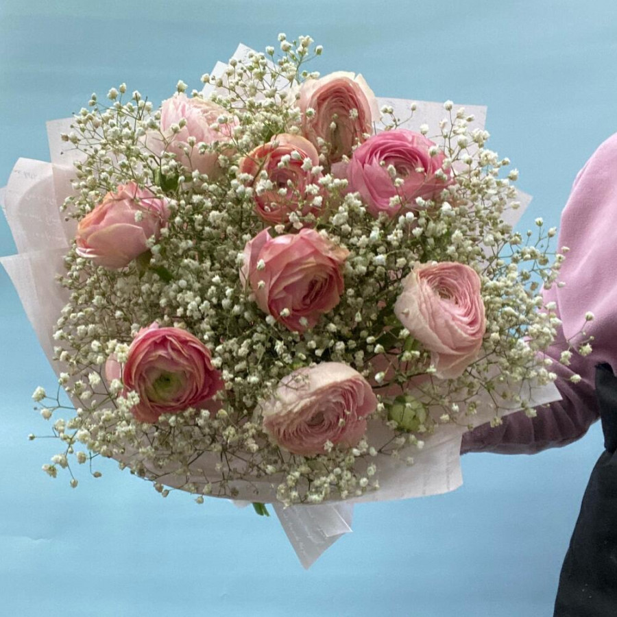 Букет из розовых ранункулюсов с белой гипсофилой в Асбесте