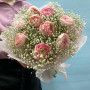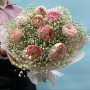 На фото букет из розовых ранункулюсов с белой гипсофилой. В составе: ранункулюс 9 шт, гипсофила 9 шт, дизайнерская упаковка 1 шт, атласная лента 1 шт, . Все цветы свежие и ароматные, букет красиво оформлен и отлично подходит для подарка. Доступна доставка цветов или самовывоз.